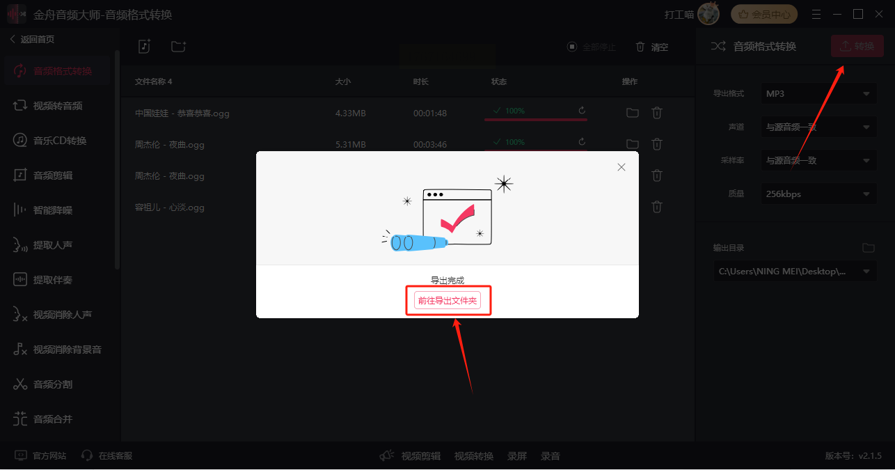 支持同时处理多个音频文件,转换完成后系统会自动标记已完成任务。可通过「转换记录」功能查看历史操作,方便重复使用相同参数设置。
