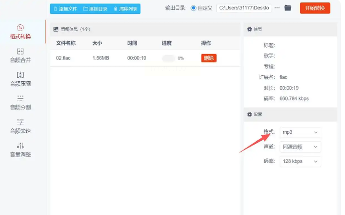 在右侧参数栏中选择输出格式为"MP3",可根据需要调整比特率(320kbps是平衡音质和体积的推荐值)。