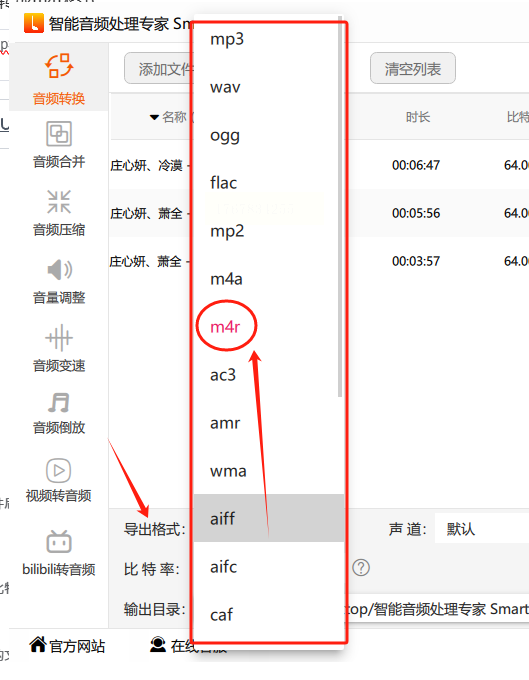 右边「格式设置」里,找到「音频格式」下拉框,选「M4R」。这里要注意!有的软件可能把M4R藏在「苹果格式」分类里,仔细看看别选错成M4A了!