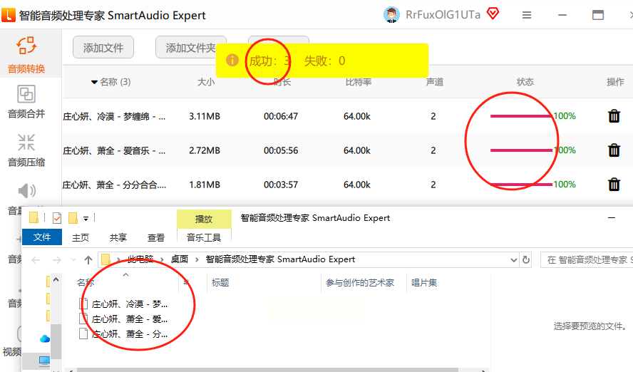 所有设置好后,点右上角的「开始转换」按钮。进度条走完就会提示"转换成功",整个过程大概几秒到十几秒,看文件大小(一首30秒的歌一般10秒内搞定)。