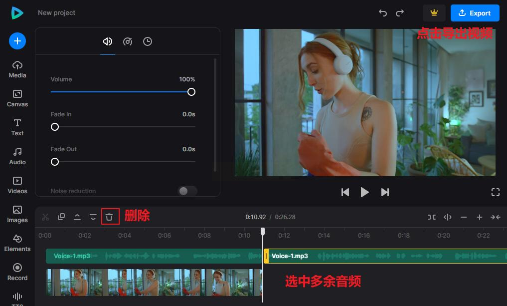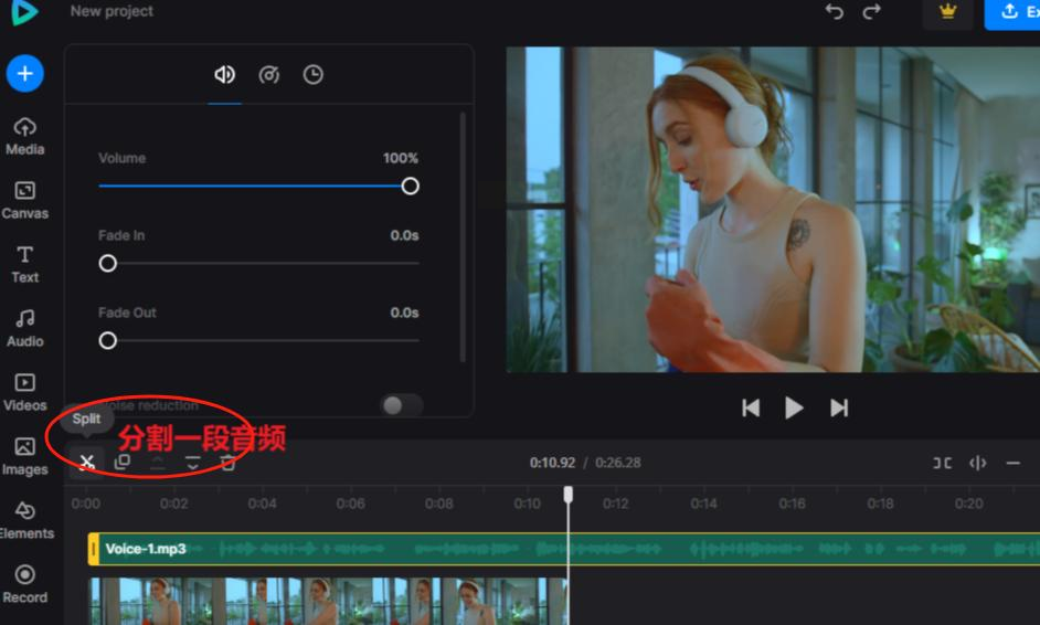 如果音频长度超过视频,或者需要删除多余的片段,点击时间轴上的音频或视频片段,然后选择“Delete”按钮删除。如果需要精确分割,可以在时间轴上找到合适的位置,点击“Split”按钮将片段分成两部分,然后删除不需要的部分。