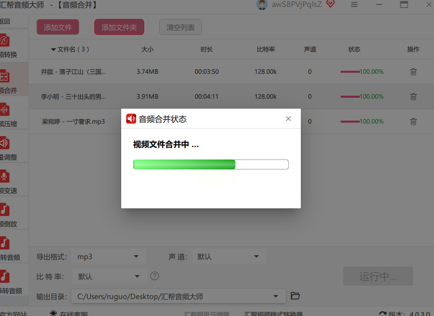软件会自动处理并生成新的音频文件,合并过程的进度会实时显示在界面上。
