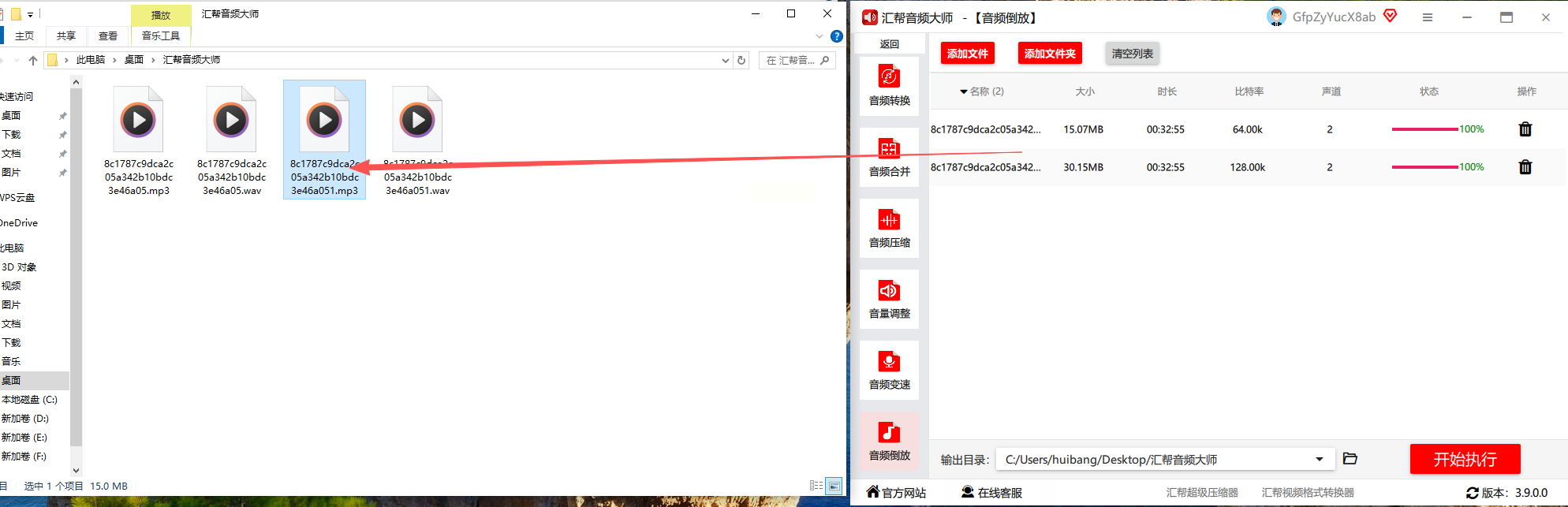 确认所有设置无误后,点击“开始执行”按钮,软件会自动完成音频倒放处理,并生成新的文件。处理完成后,你可以在指定路径中找到倒放后的音频文件,轻松完成录音倒放。