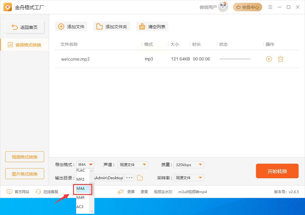 3. 在格式下拉框选择“M4A”,下方会出现声道、采样率等高级选项(新手可保持默认);