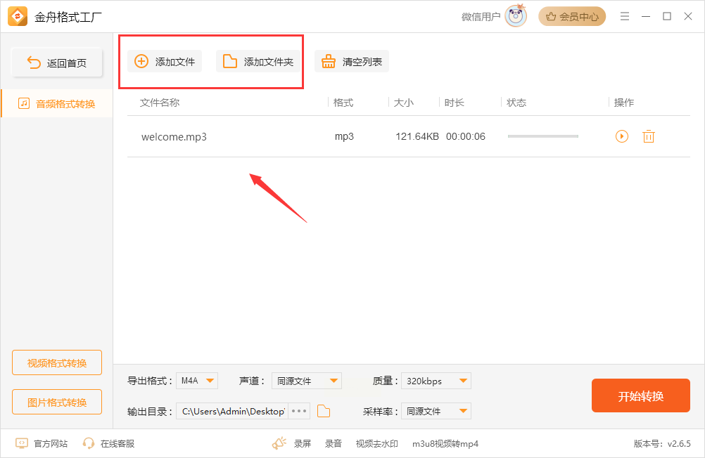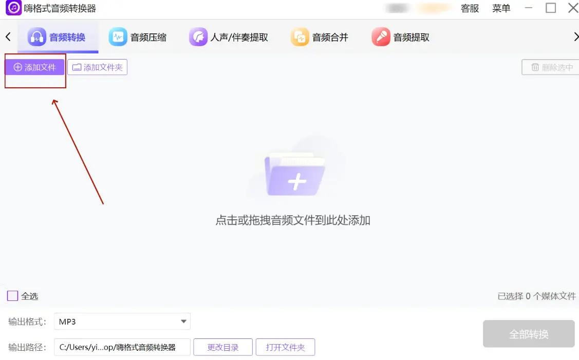 2. 点击“添加文件”,支持直接拖拽多个MP3文件(批量转换超实用);