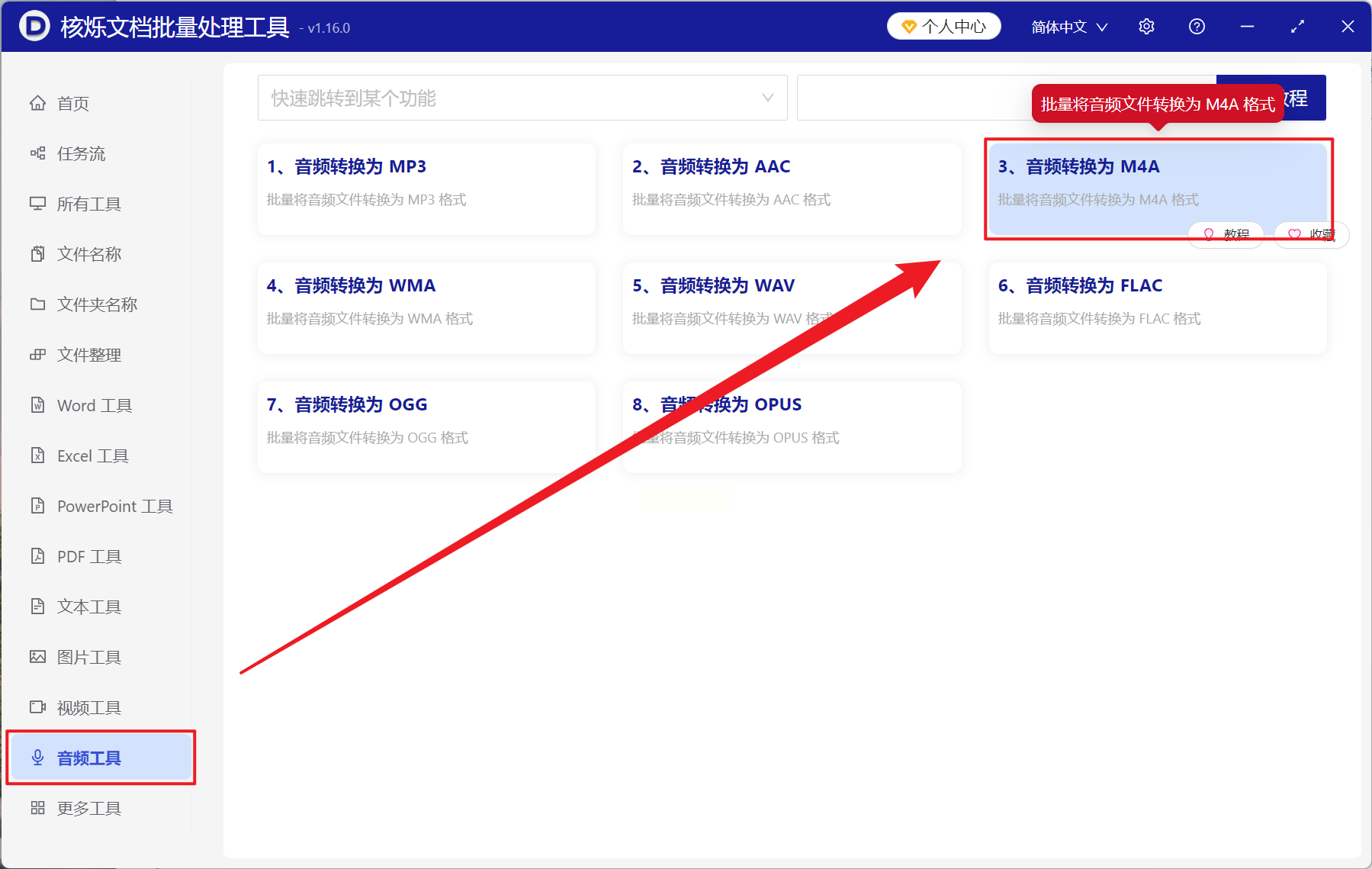 1. 打开软件后,在“音频工具”中找到“音频转M4A”;