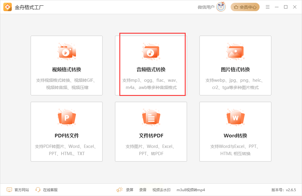 1. 双击桌面图标启动软件,左侧菜单选“音频格式转换”;