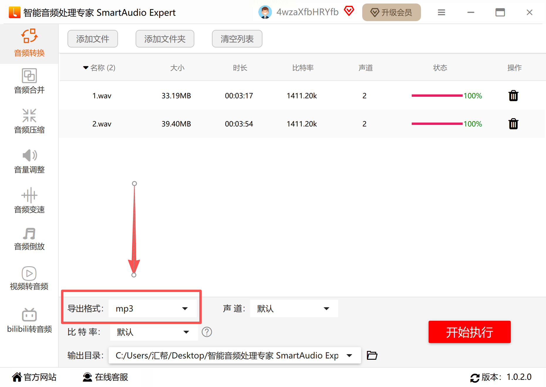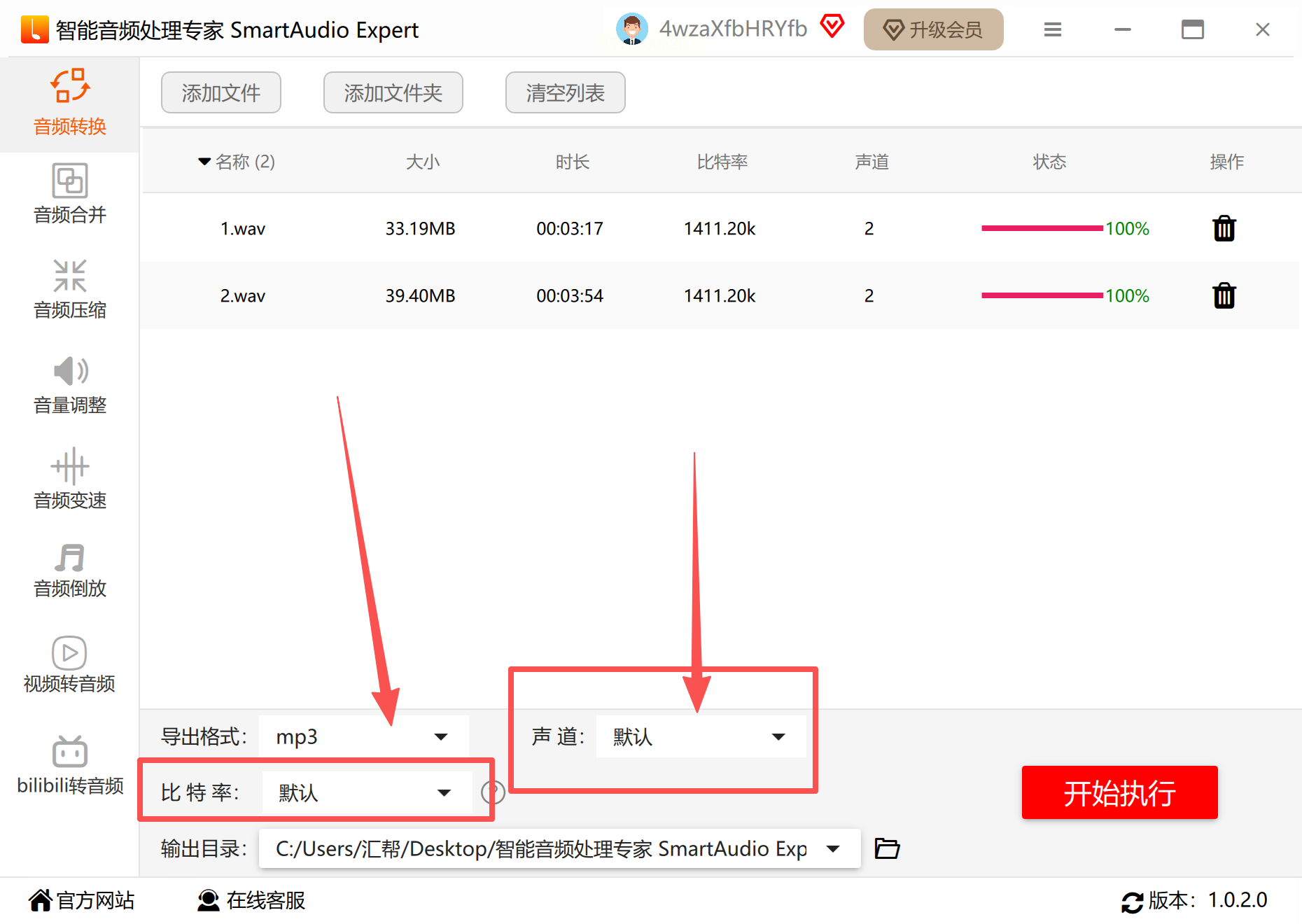 这里可以同时设置多个输出参数:比特率、采样率、静音检测(自动去掉无声段)。