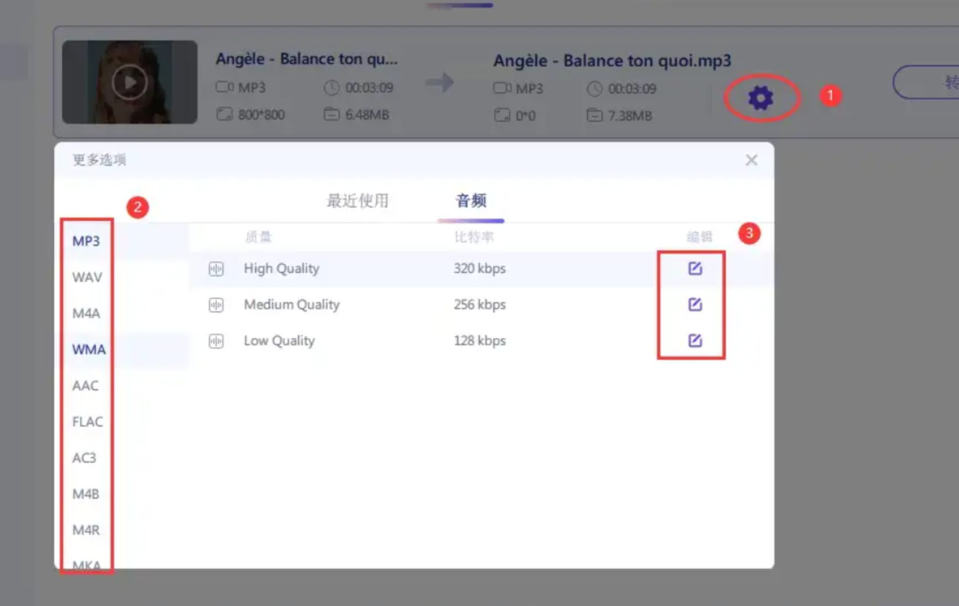 旁边的「高级设置」里能调比特率(建议选128-320kbps,普通用户128足够)和声道(单声道省空间,双声道音质更好)。