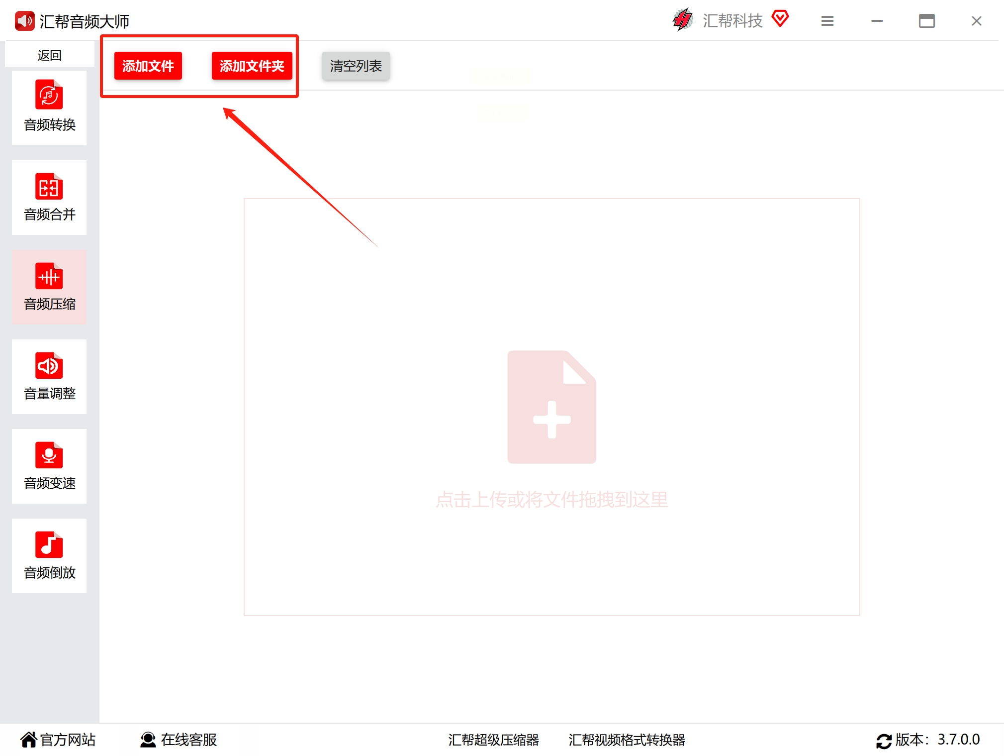 2. 中间区域有个“+”号按钮,点它导入要压缩的音频文件(一次能拖一堆,省时间!)。