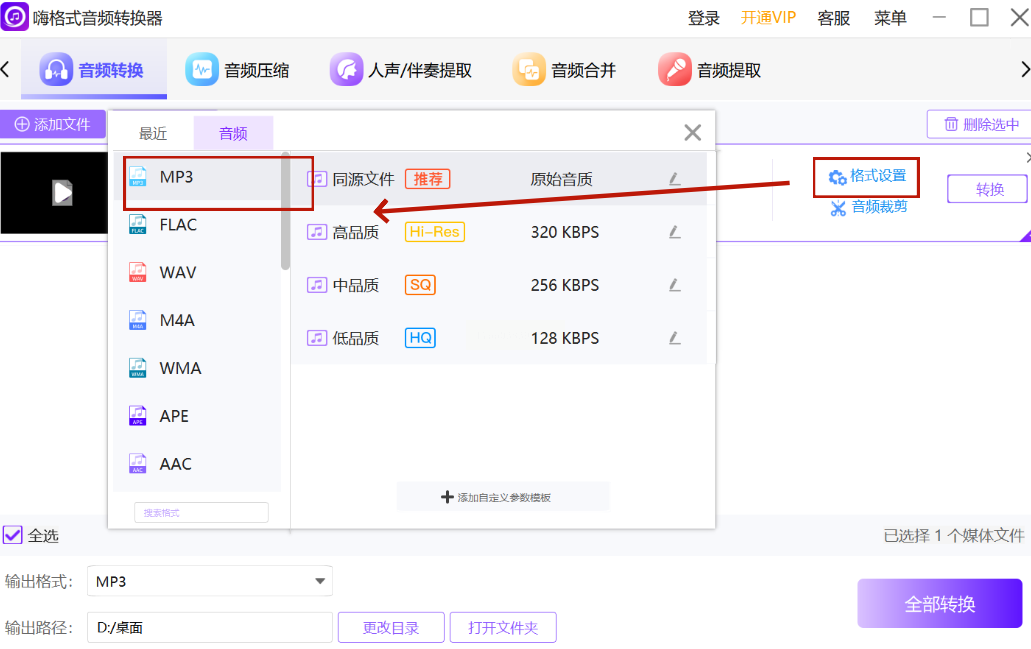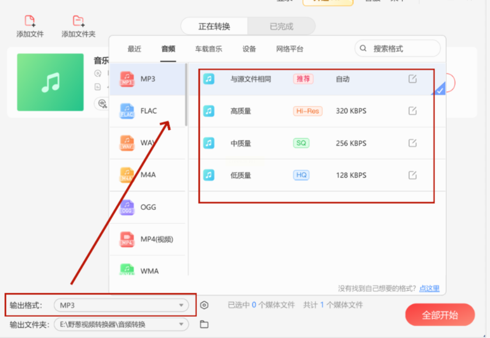 2. 选择输出格式:在格式选项里找到MP3,点击后系统会自动分析文件参数。如果文件很大,转换可能需要一点时间,耐心等进度条走完。