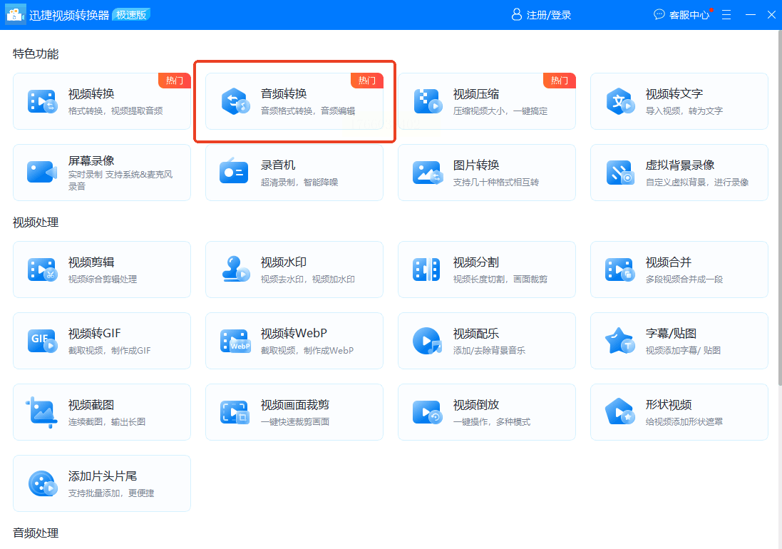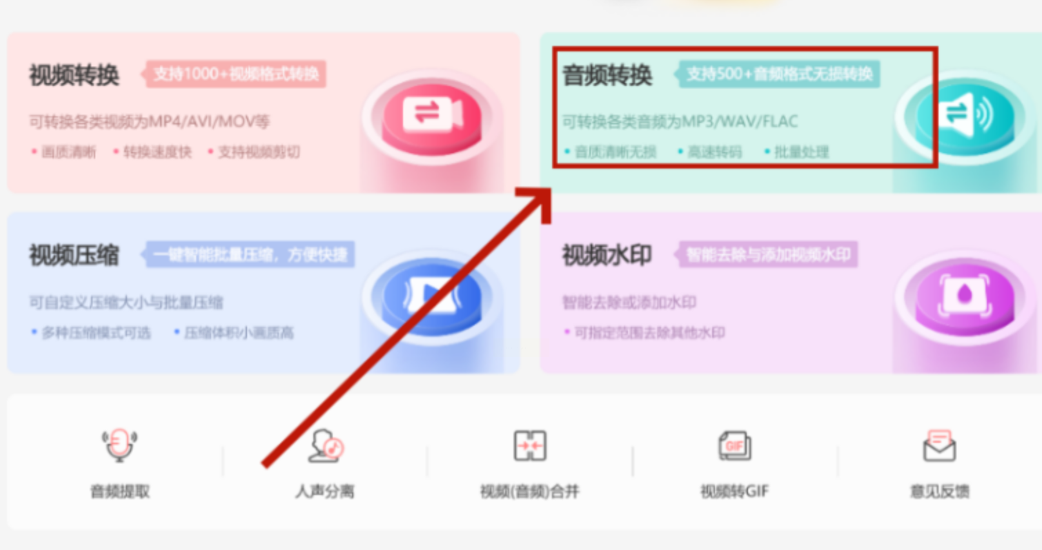 1. 音频转换入口:进入软件后,选"音频转换"功能。这里不仅能处理音频,还能批量转换视频里的背景音乐,算是个"全能助手"。