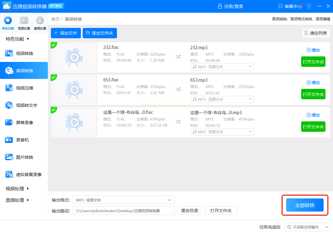 3. 开始批量转换:点击"全部转换",软件会默默完成转换,你可以去泡杯茶,回来就能看到处理好的MP3文件躺在指定文件夹里。