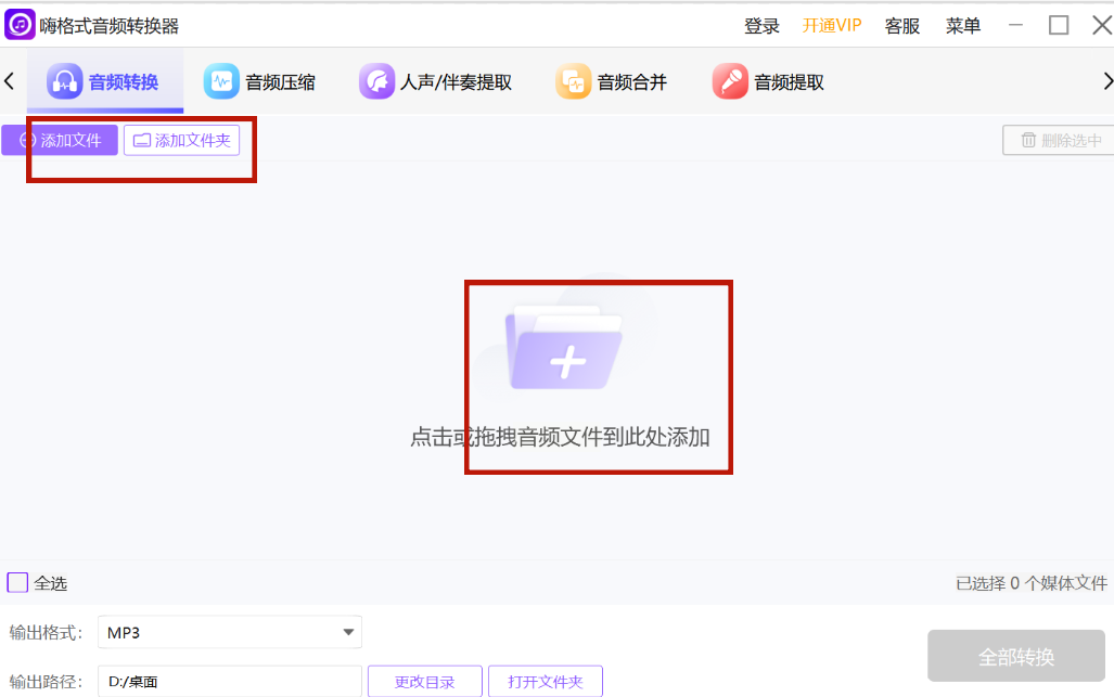 2. 批量导入文件:如果是零散文件,直接点击"添加文件";若是整个文件夹的音频,就用"添加文件夹"功能。懒人操作?直接把文件拖到软件窗口里也行,简单又快捷。