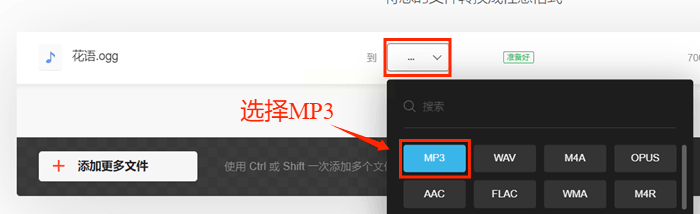 3. 文件上传后,网站会问你“要转换成什么格式?”。你会在旁边找到一个格式选择按钮(可能是下拉菜单,也可能显示为“···”),点开它,在长长的列表里找到“MP3”并选中。