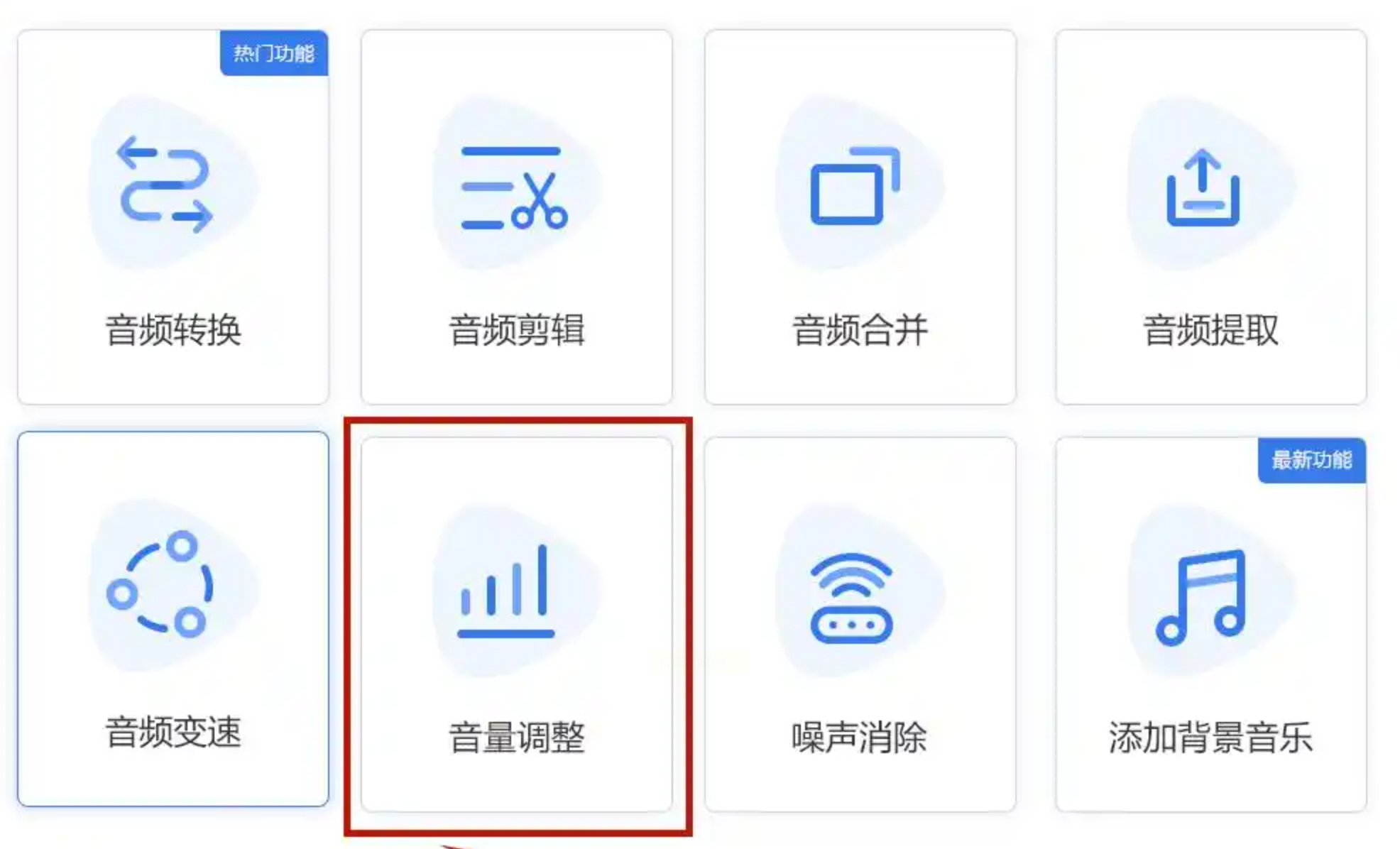 - 打开工具首页,找到【编辑音频】功能区,选择【音量增强】选项(不同版本可能名称略有差异)。