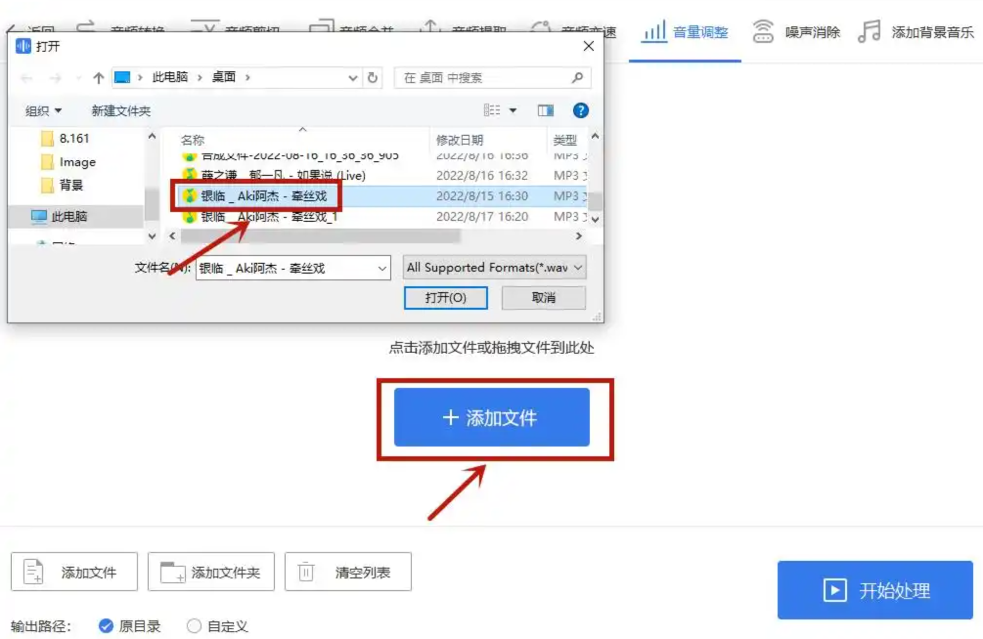 - 点击【添加文件】,导入需要调整的MP3、WAV等格式文件(支持批量添加,上限一般为20个)。