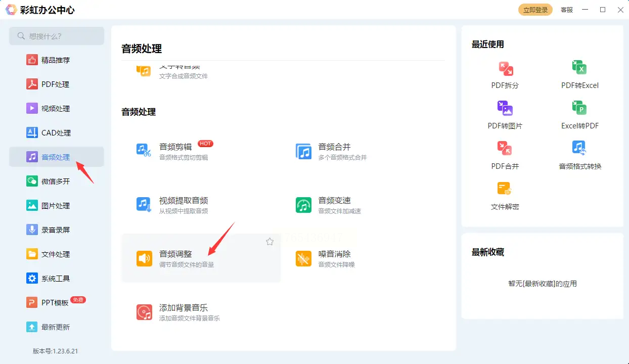 - 打开彩虹办公软件,在【音频处理】模块找到【音频调整】功能(通常在右侧功能区,下拉菜单可见)。