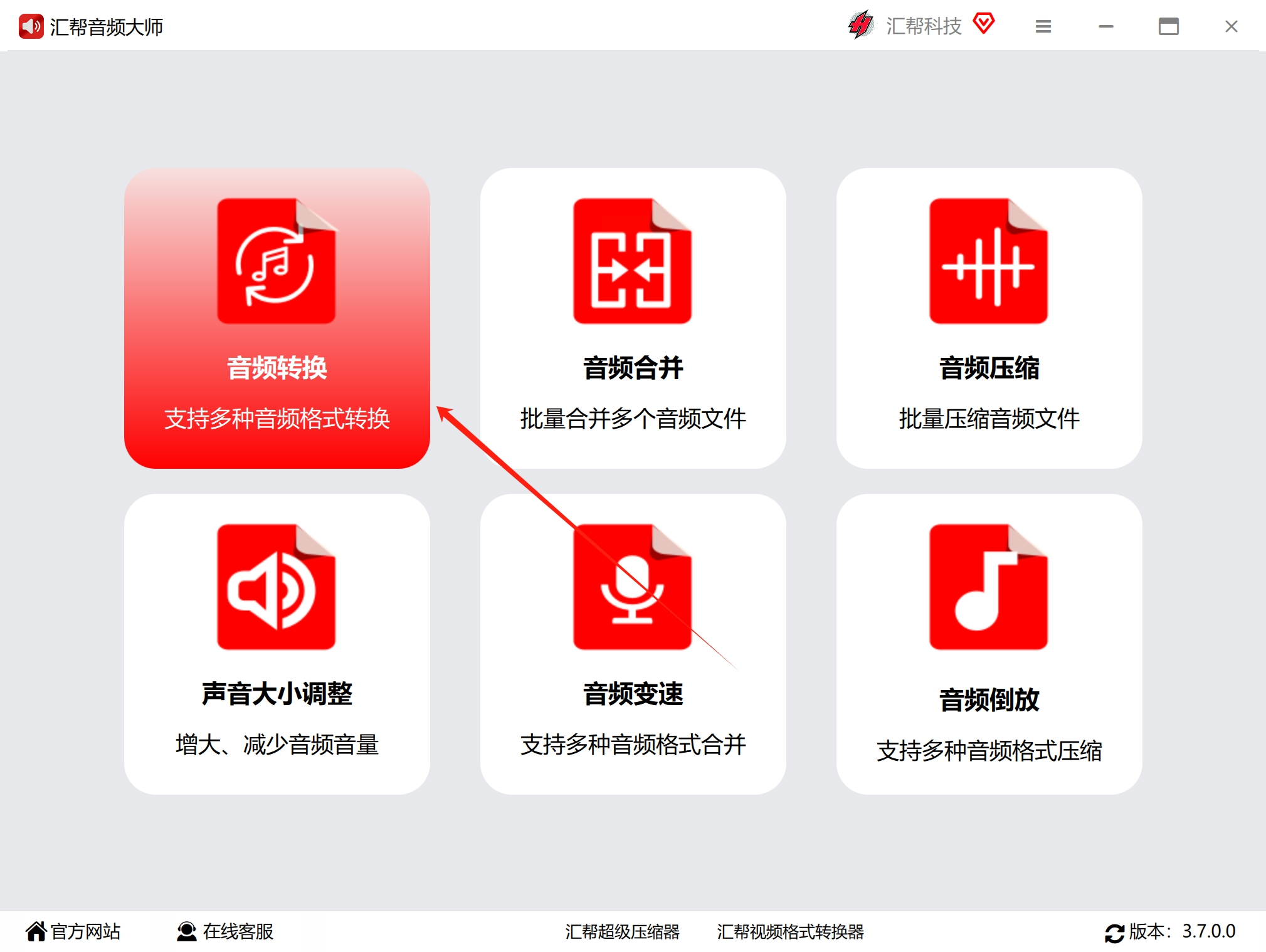 2. 第二步,打开软件,直奔主题。 软件界面很清爽,功能一目了然。我们这次要格式转换,就直接点击主界面上那个显眼的 【音频转换】 功能。