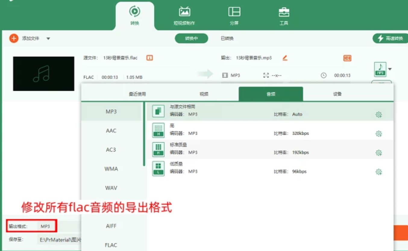 4. 第四步,设定转换目标:MP3。 文件都进来后,看界面中间或右侧,找一个叫 【输出格式】 或 【导出格式】 的选项。点开下拉菜单,在音频格式里找到 【MP3】,选中它。