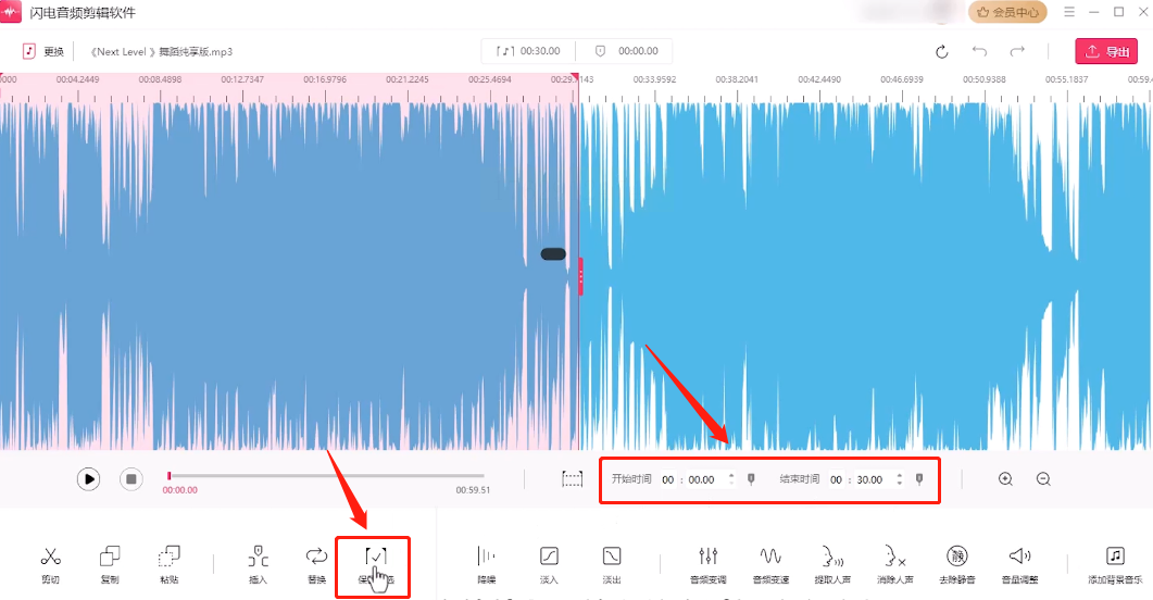 3. 添加过渡效果:选中两段音频之间的连接处(时间轴上的空白处),可以点击【淡入】和【淡出】按钮,让过渡更自然。也可以设置【音量】大小,避免衔接处突然变声