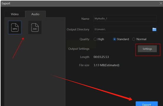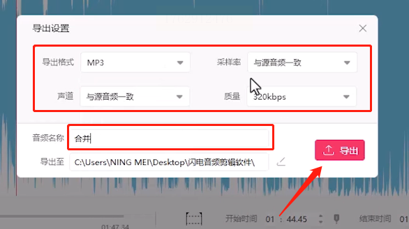 4. 导出音频文件:所有音频都拼接好后,点击右上角的【Export】按钮。在导出设置里: