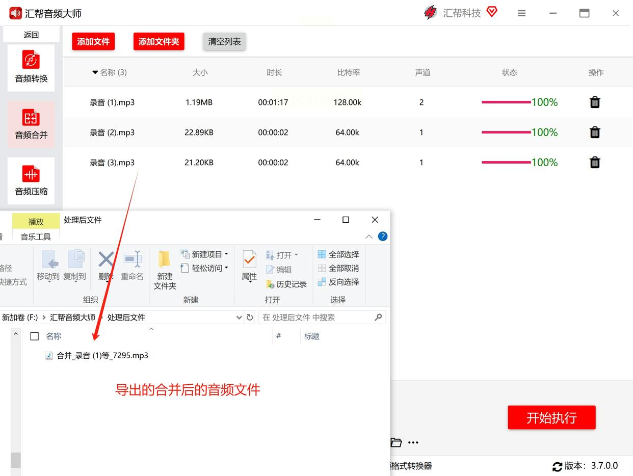 5. 开始合并:所有设置完成后,点击【开始合并】按钮。软件会在后台快速处理,完成后会自动弹出文件位置窗口,让你直接查看合并好的音频。