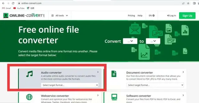 第二步,找到音频转换器。首页上有很多选项,你找第一排的“Audio converter”,点进去。