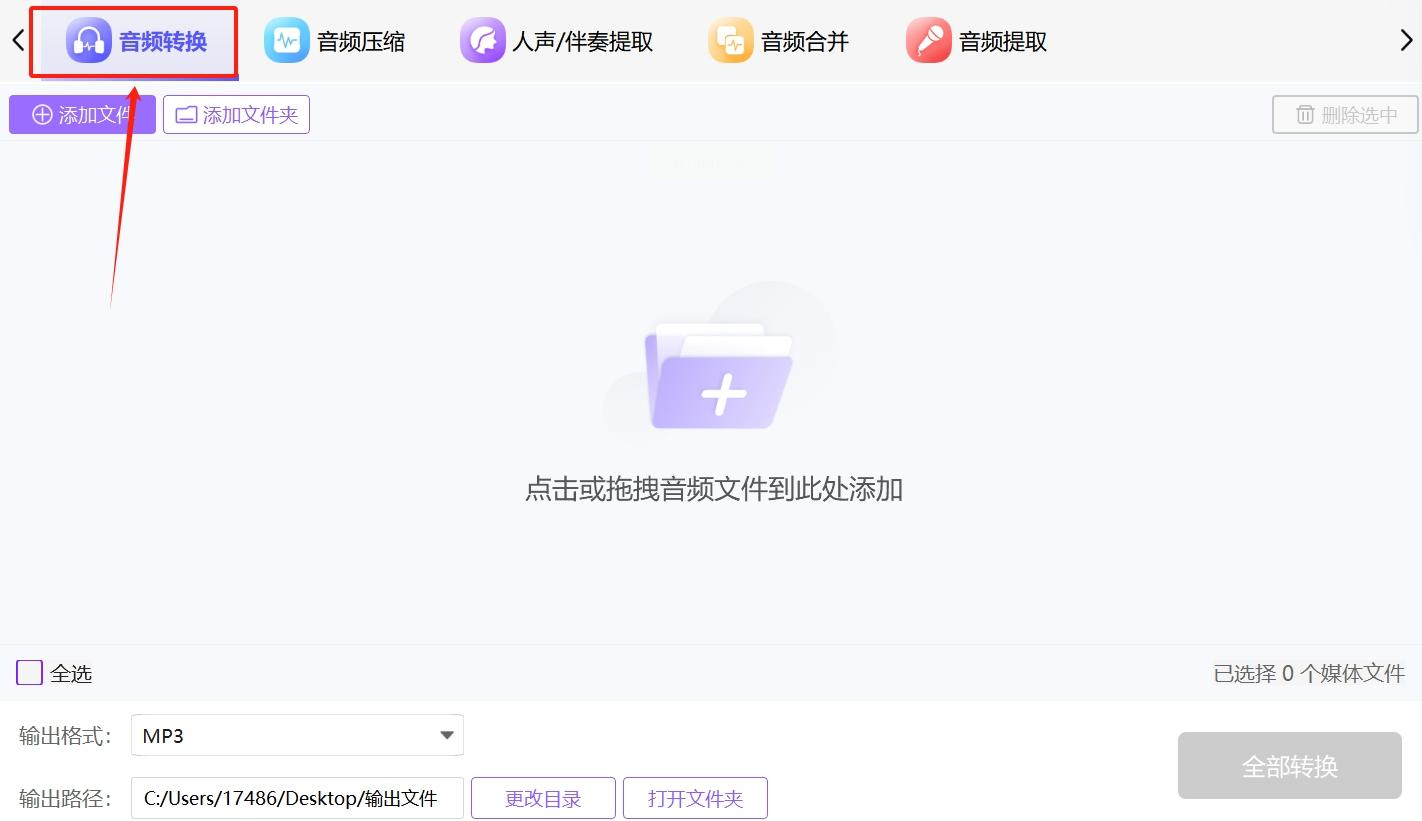 第二步,进入音频转换模块。打开后,主界面上会有好几个选项,你点一下“音频转换”那个按钮,它就跳转到文件操作页面了。