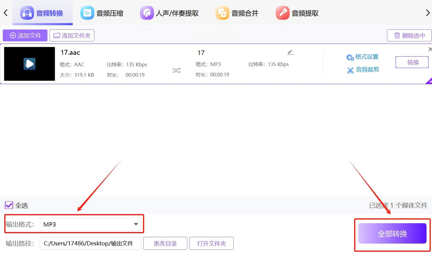 第三步,确认左下角的输出格式是MP3,没问题就点“全部转换”。