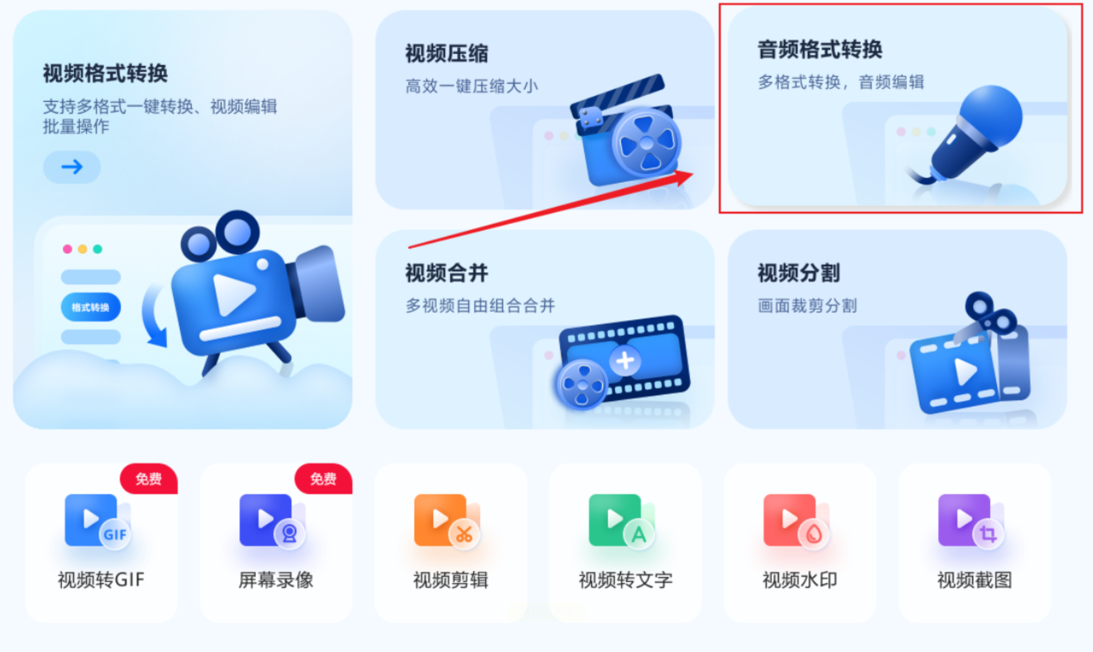 步骤一:启动软件后,在主界面中寻找到【音频格式转换】功能模块并点击进入。