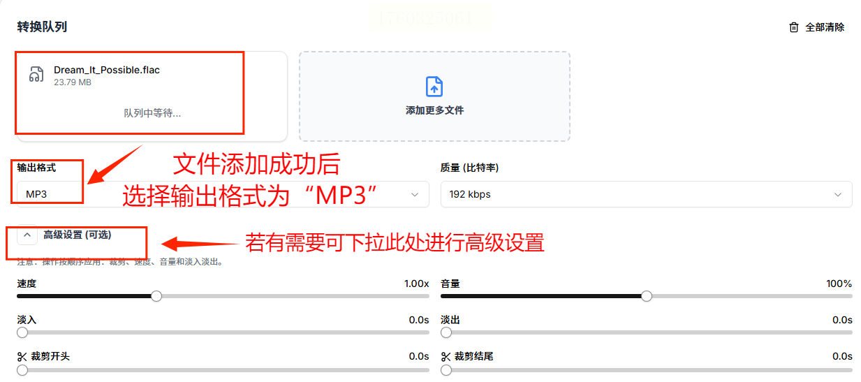 步骤2:文件上传成功后,在输出格式选项里选择“MP3”,可以根据需要调整音频的质量参数,比如比特率、采样率等,对音质要求高的话可以适当提高参数。