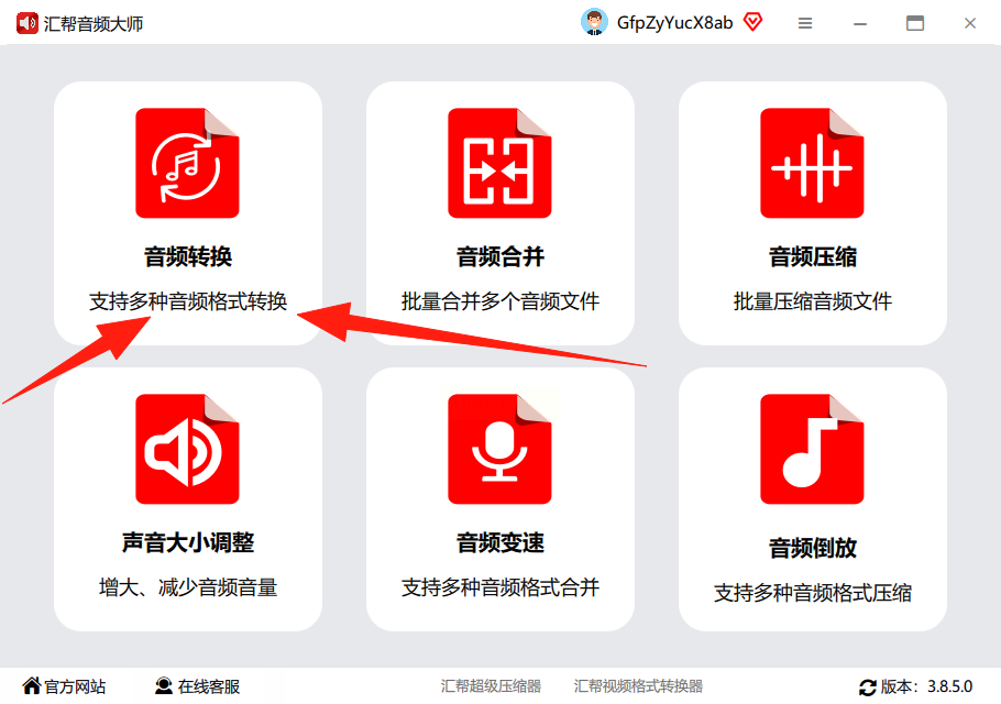 步骤一:打开《汇帮音频大师》,在主界面找到并点击“音频转换”功能模块。
