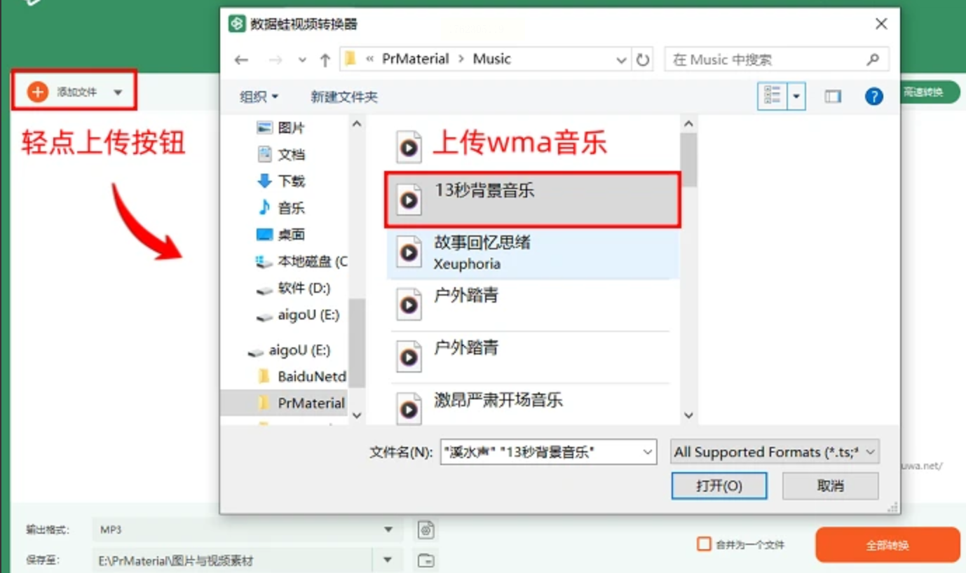 第三步,点击"添加文件",把你想要转换的WMA文件全部选中。这里有个小技巧:可以按住Ctrl键多选,一次性添加几十个文件都没问题。