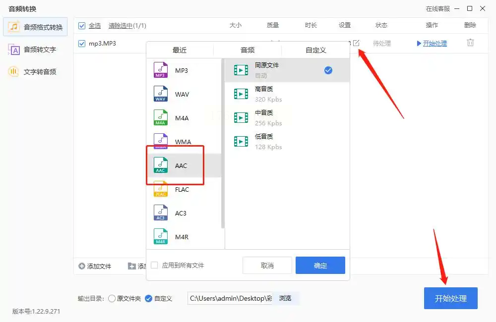 3. 精准格式配置:点击“输出格式”下拉菜单选择AAC,右侧参数区可自定义比特率(建议128-320kbps)、采样率(44.1kHz或48kHz),转换完成后点击“开始处理”即可。