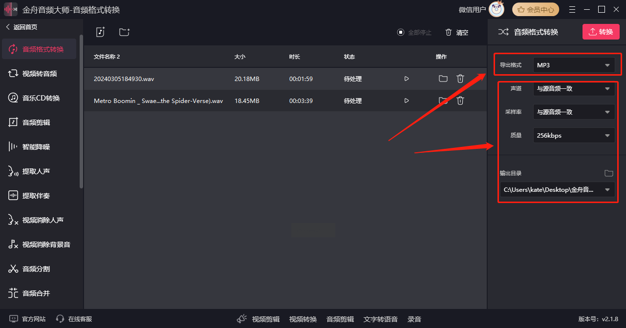 步骤三:在软件右侧的设置栏,从“输出格式”中选择“MP3”。同时,你可以预览和调整音频质量、采样率等参数,并设置好输出目录。