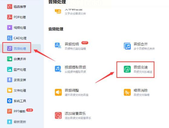 1. 进入变速模块:启动软件后,在主界面找到【音频工具】分类,点击【音频变速】选项。这里会显示"单文件变速"和"批量处理"两种模式,前者适合处理单个音频,后者适合批量转换。
