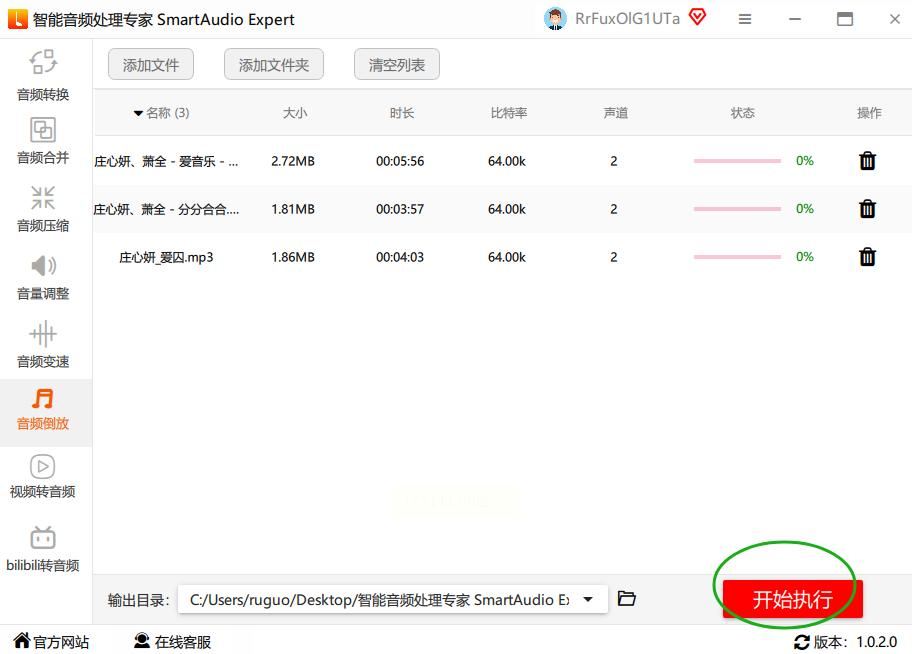 4. 开始倒放:点击“开始执行”按钮,软件会在状态栏显示进度条,完成后自动弹出文件目录。