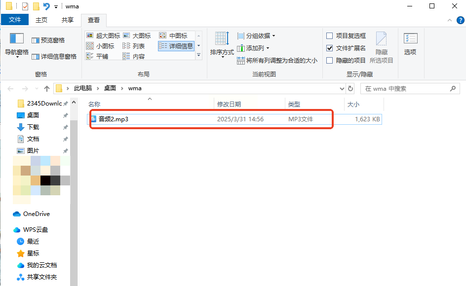 1. 打开存放WMA文件的文件夹,点击顶部菜单栏的“查看”选项,勾选“文件扩展名”(这样就能看到文件后缀了)。