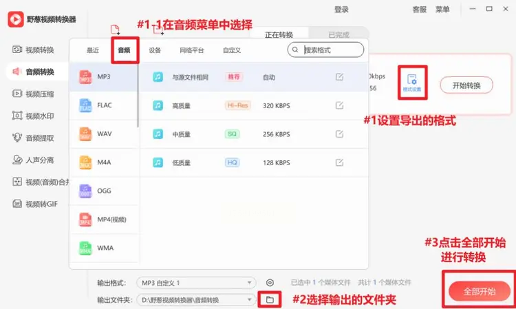 3. 在输出格式中选择“MP3”,可设置比特率等参数,确认后点击“开始转换”。