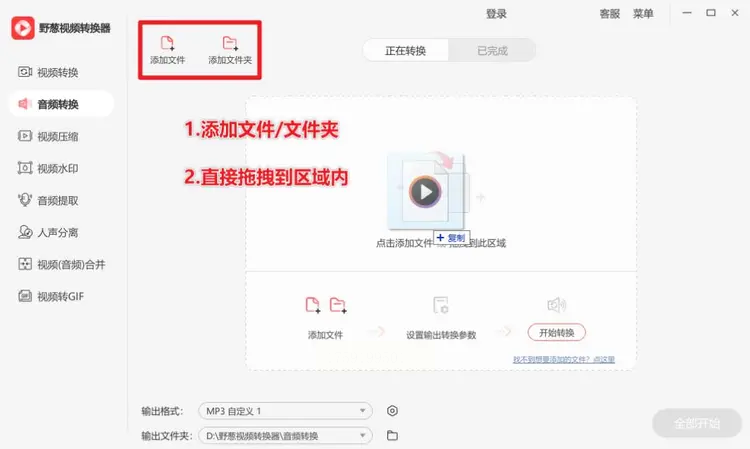进入音频转换界面后,你会看到一个“添加文件”的按钮。点击它,或者直接将WMA文件从文件夹拖拽到软件界面中。如果有多个文件需要转换,支持批量上传,一次处理多个文件更高效。