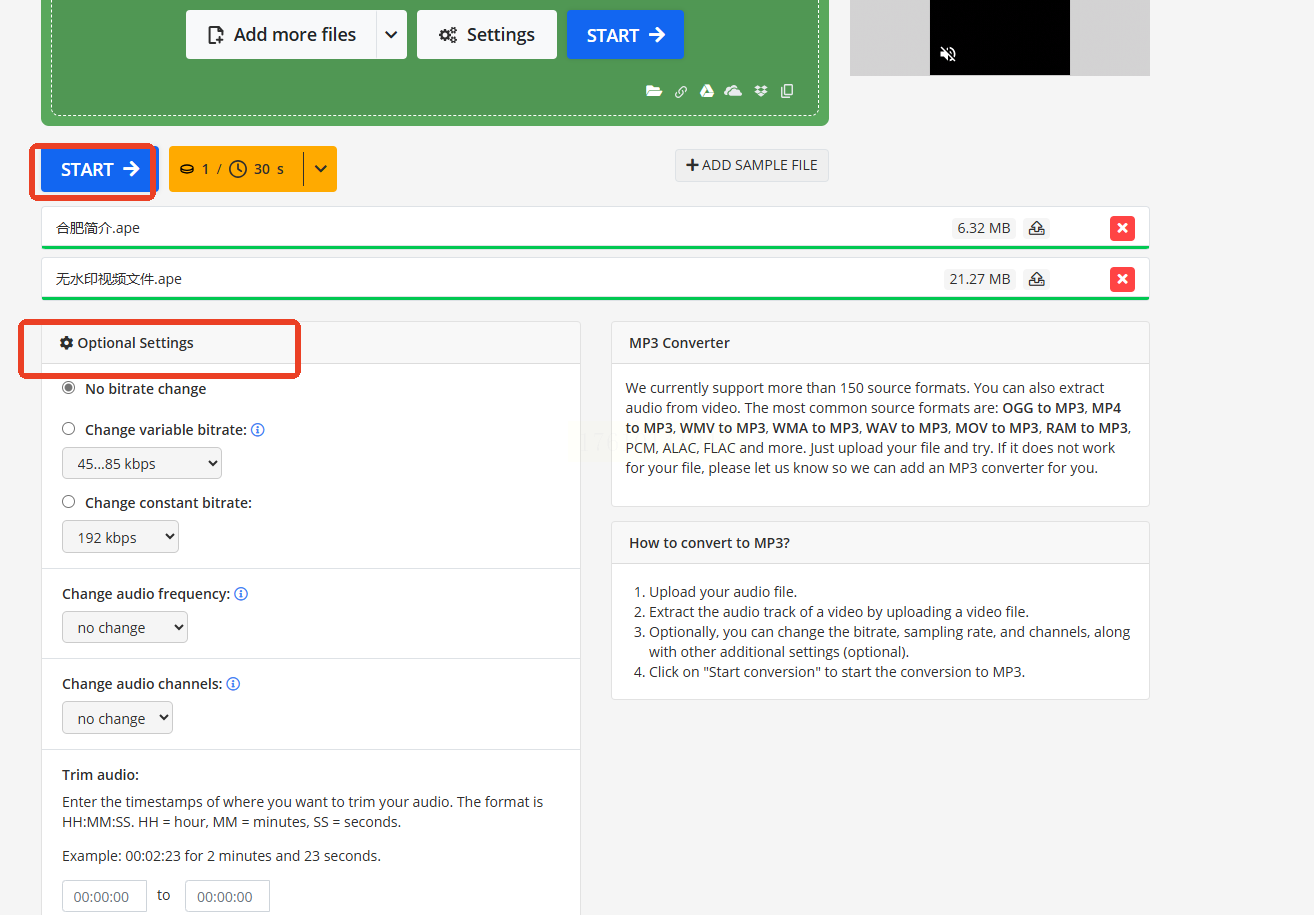 步骤四:确认设置无误后,点击"START"按钮启动转换进程,完成后直接下载生成的MP3文件。