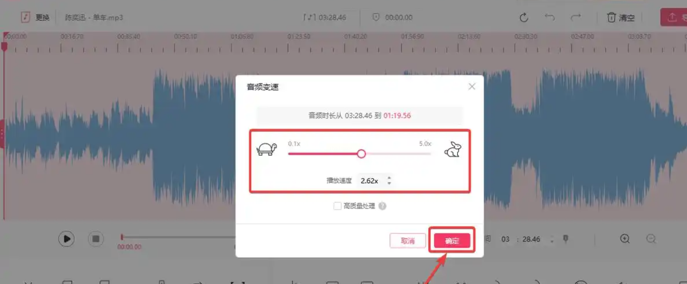 2. 点击顶部菜单"音频变速",在弹出窗口设置速度倍数(1.0-2.0倍);