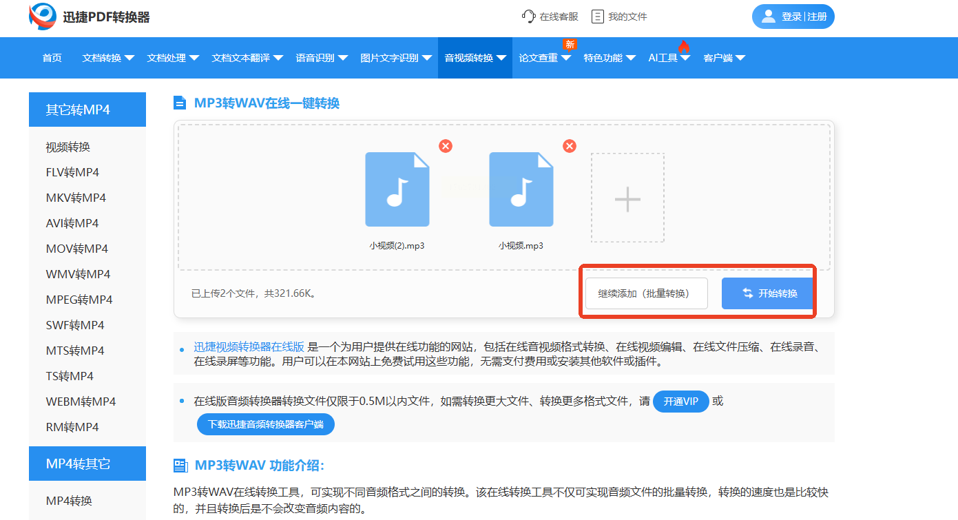 步骤三:上传MP3文件,在输出格式中选择WAV。系统支持多种格式互转。