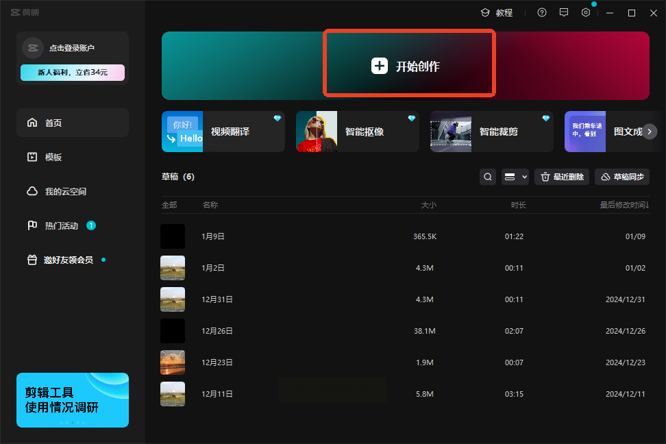 步骤一:打开剪映,点击开始创作,导入你需要合并的音频文件。