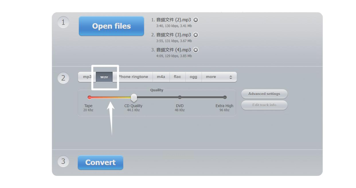 进入网站后,找到“Open files”或类似的上传按钮,从你的电脑里选择需要转换的MP3文件。