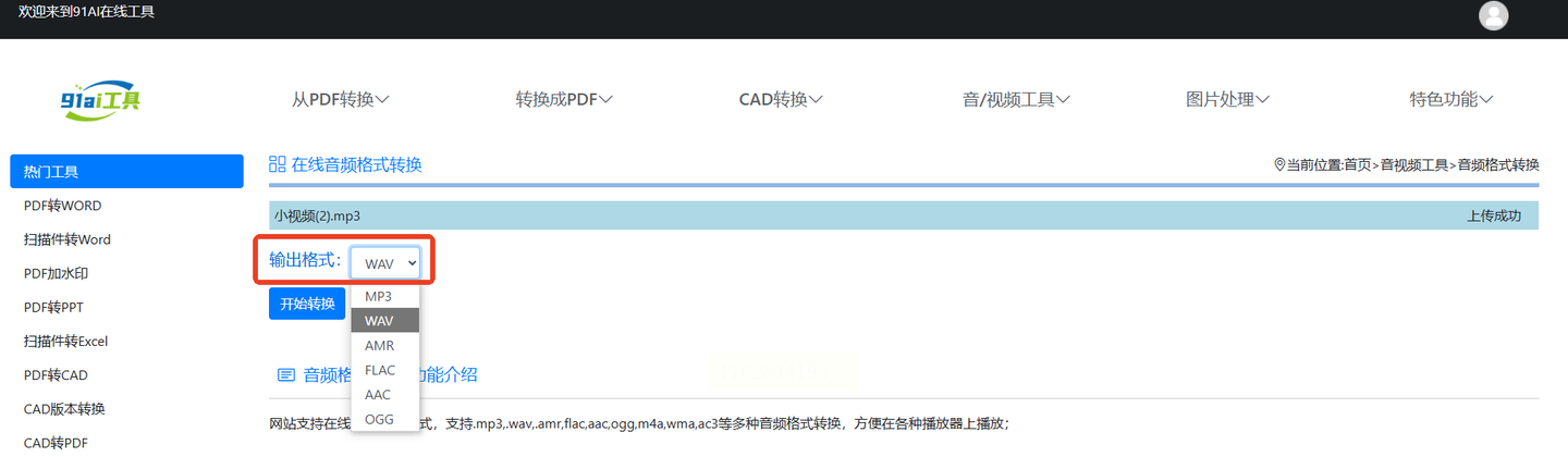 登录后,找到“音频格式转换”功能。它支持包括MP3和WAV在内的多种音频格式。