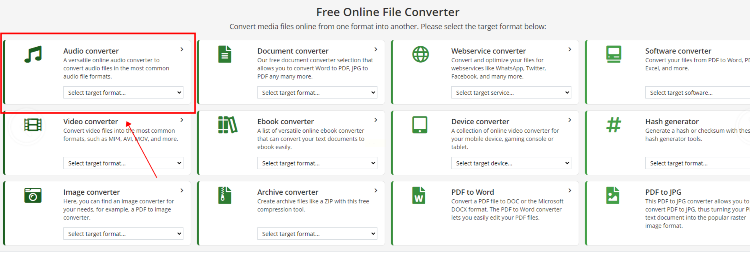 2. 选择音频转换功能:首页找「Audio Converter」,点击进去后会看到格式选择列表。
