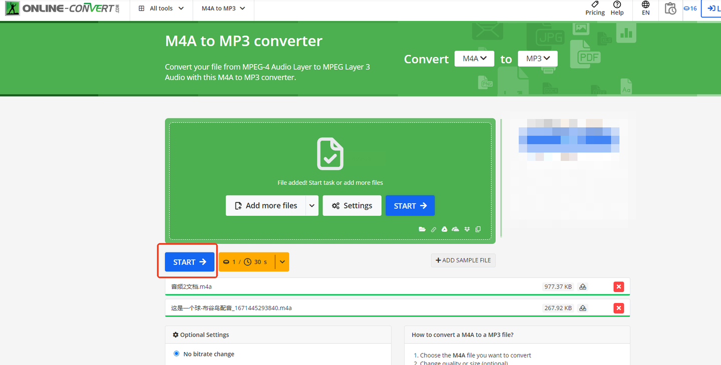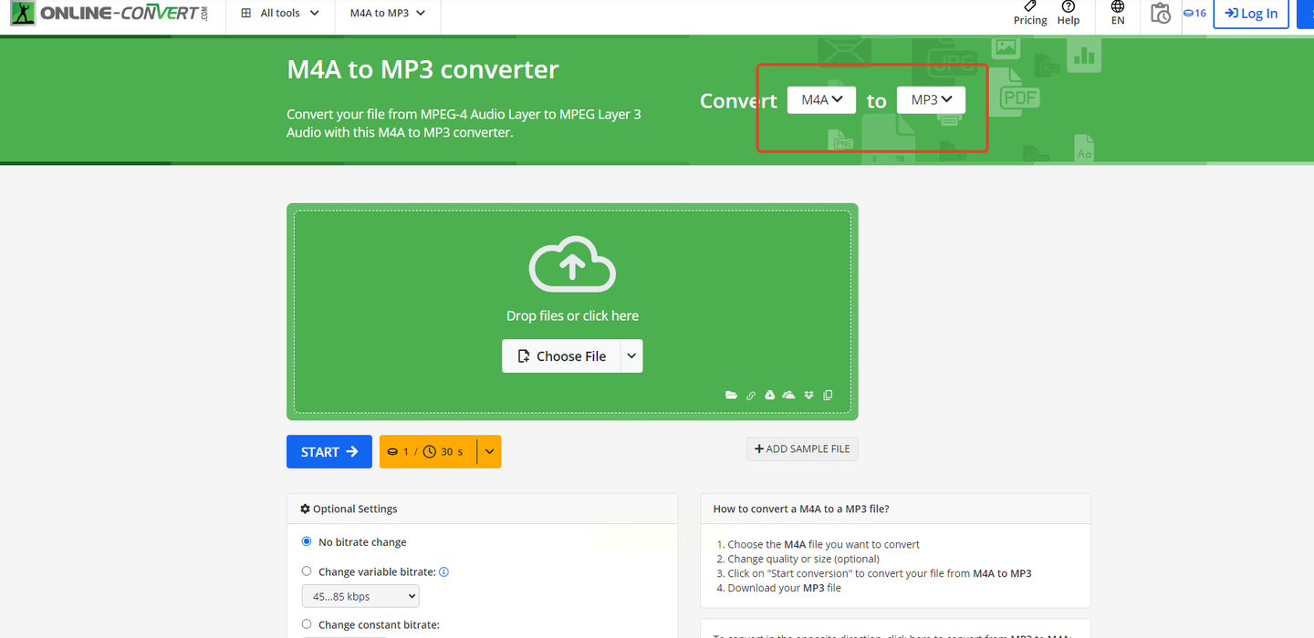 步骤一:通过搜索引擎访问Online-Convert网站。在首页的音频转换器中,明确设置源格式为“M4A”,目标格式为“MP3”。