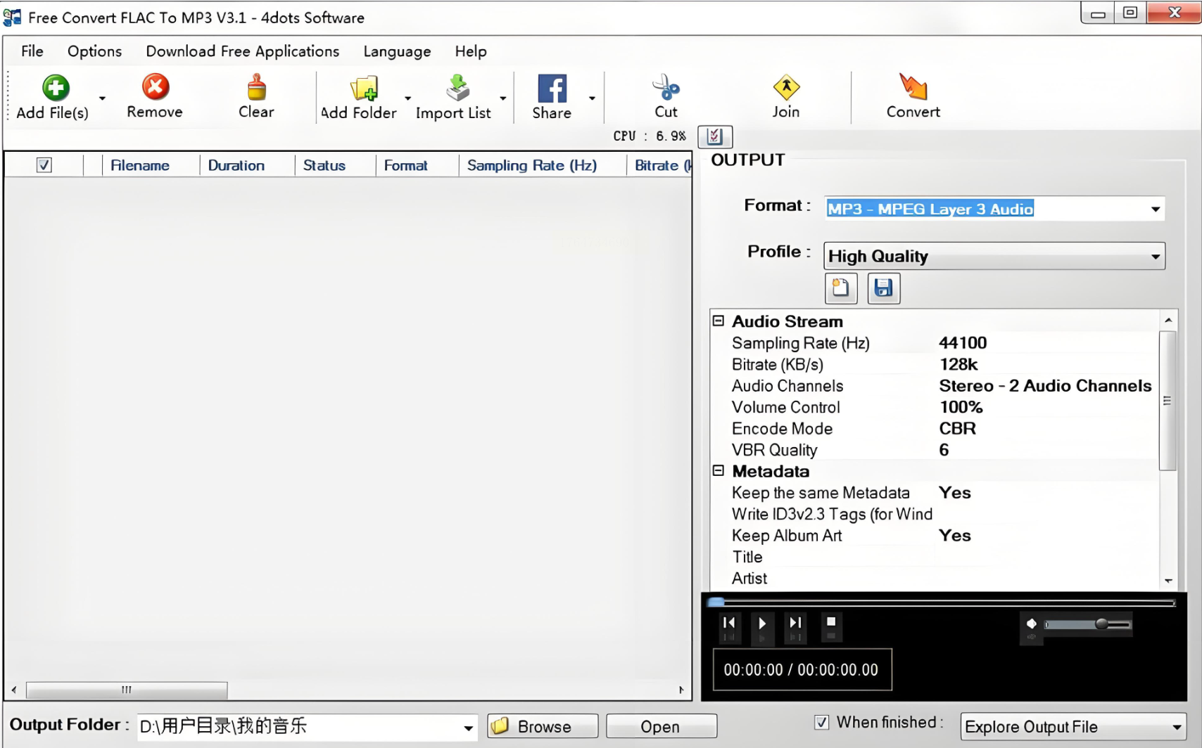 点击界面中的“+Audio”按钮,支持单个或多个MP3文件导入。软件支持直接从CD或在线音乐平台提取音频,配合“从视频提取”功能,可将视频中的背景音乐快速转为FLAC格式,实现“音频+视频”双场景转换。